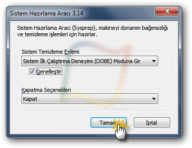 Tamam’a bastıktan sonra sistem genelleştirilmeye başlayacak. Bu sırada hiç bir şeye basmayın ve genelleştirmenin bitmesini ve bilgisayarın kapanmasını bekleyin.